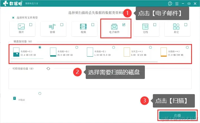第2步:根据个人需求对需要恢复的文件类型进行选择(可以只勾选电子邮件,但为了更全面扫描到数据,建议勾选所有文件类型),并勾选上需要扫描的磁盘,点击 【扫描】 ;