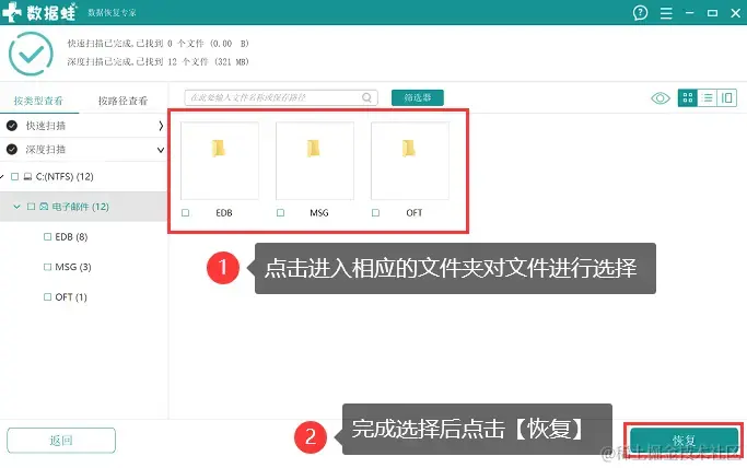第4步:深度扫描完成后,可以统一对需要恢复的电子邮件进行选择,在左侧可选择相应的邮文件类型,并点击文件夹进行选择,将所有需要恢复的文件都选择完毕后,点击【恢复】。