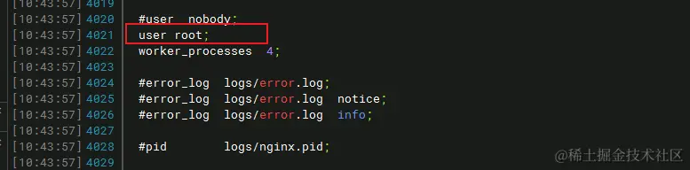 如果不一致的话,将nginx.config的user改为和启动用户一致,如下图所示: