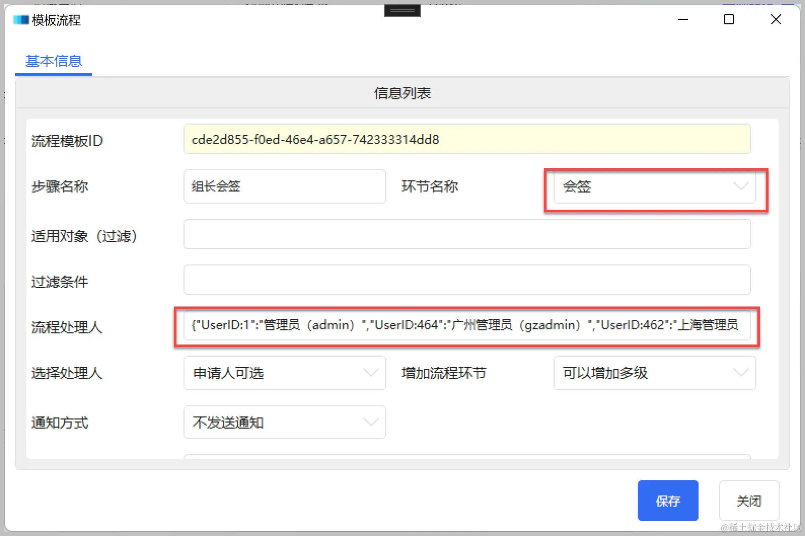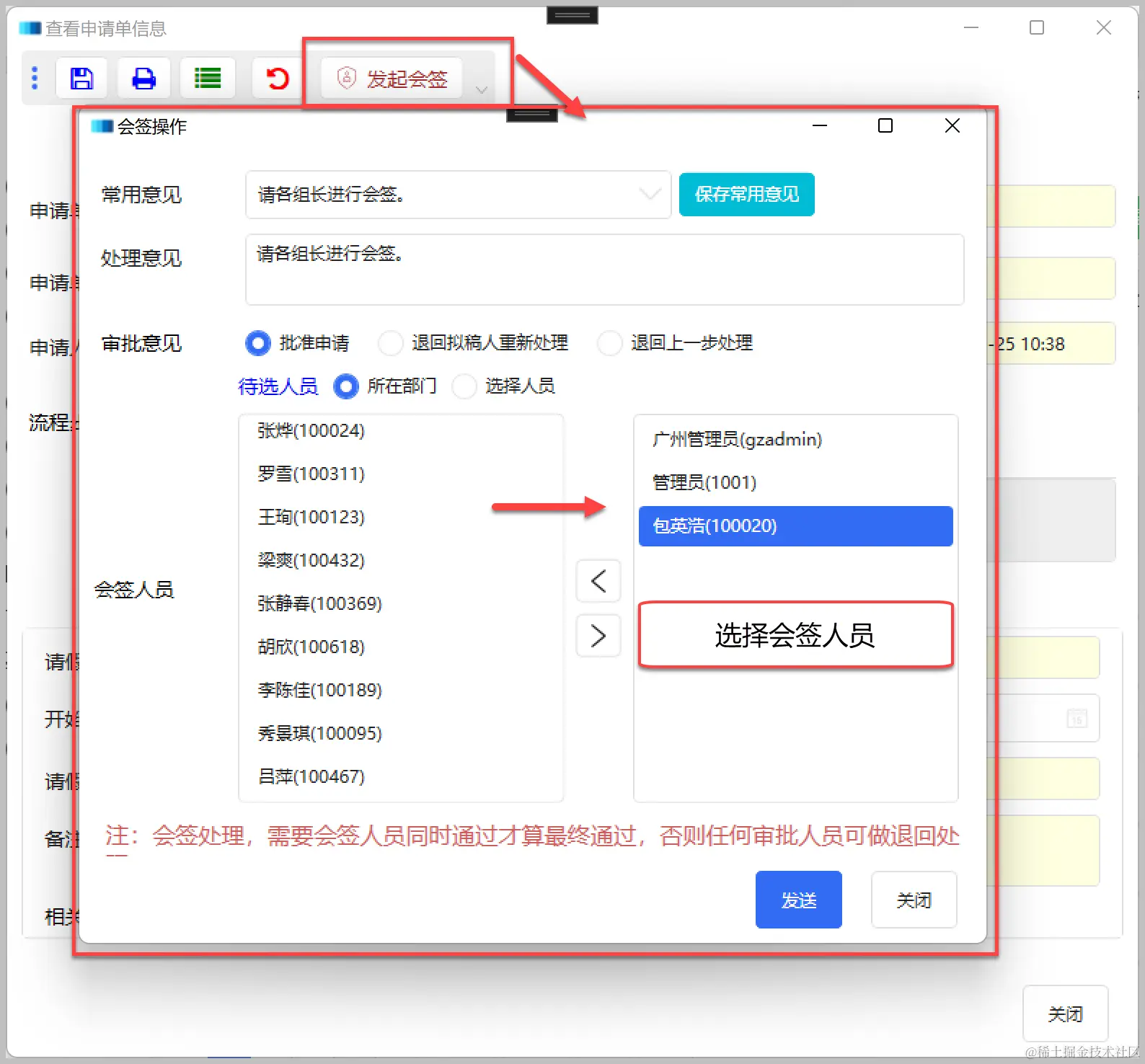 并指定了具体的处理流程人,那么在申请单中会提示发起会签处理,并从配置的JSON中解析出具体的用户供选择处理。