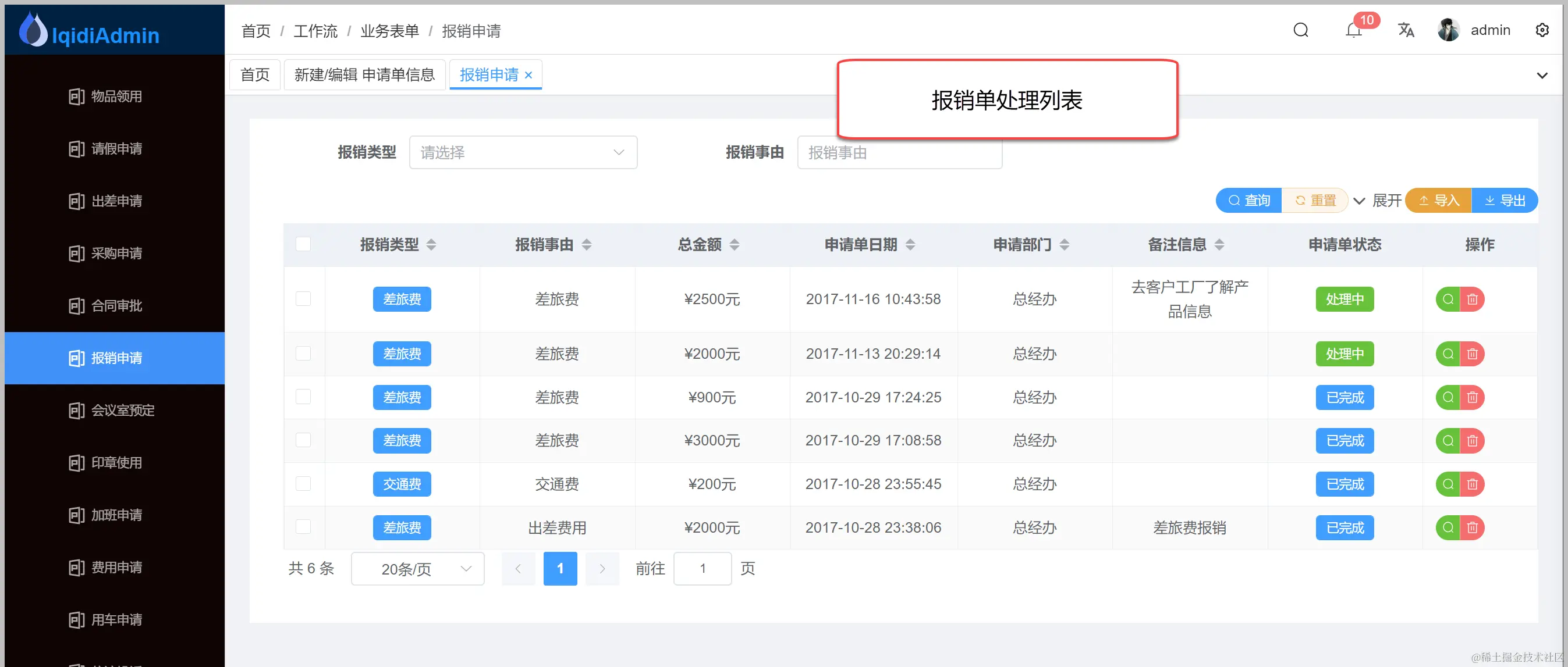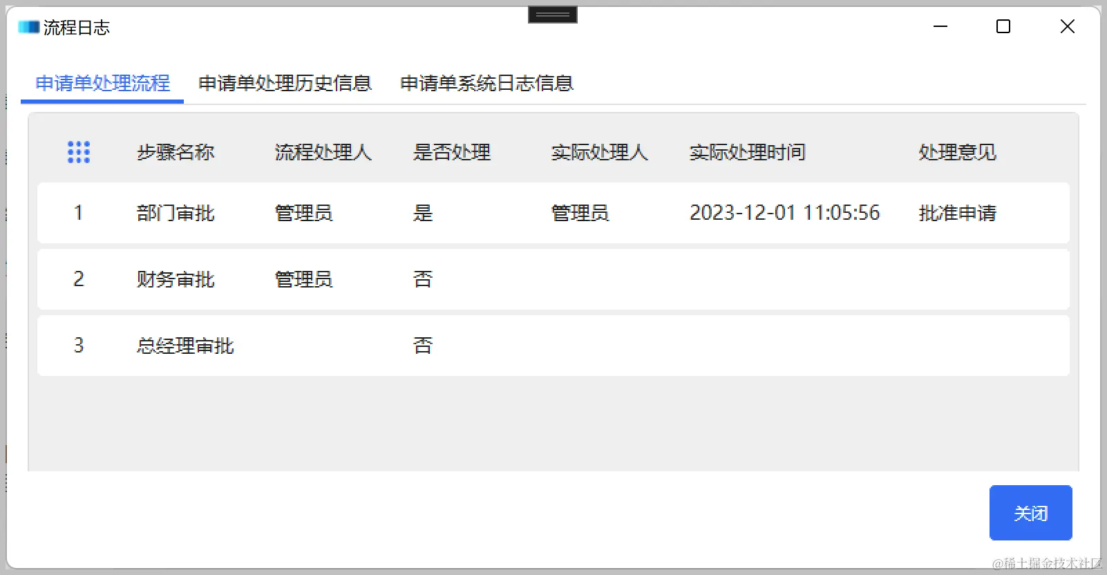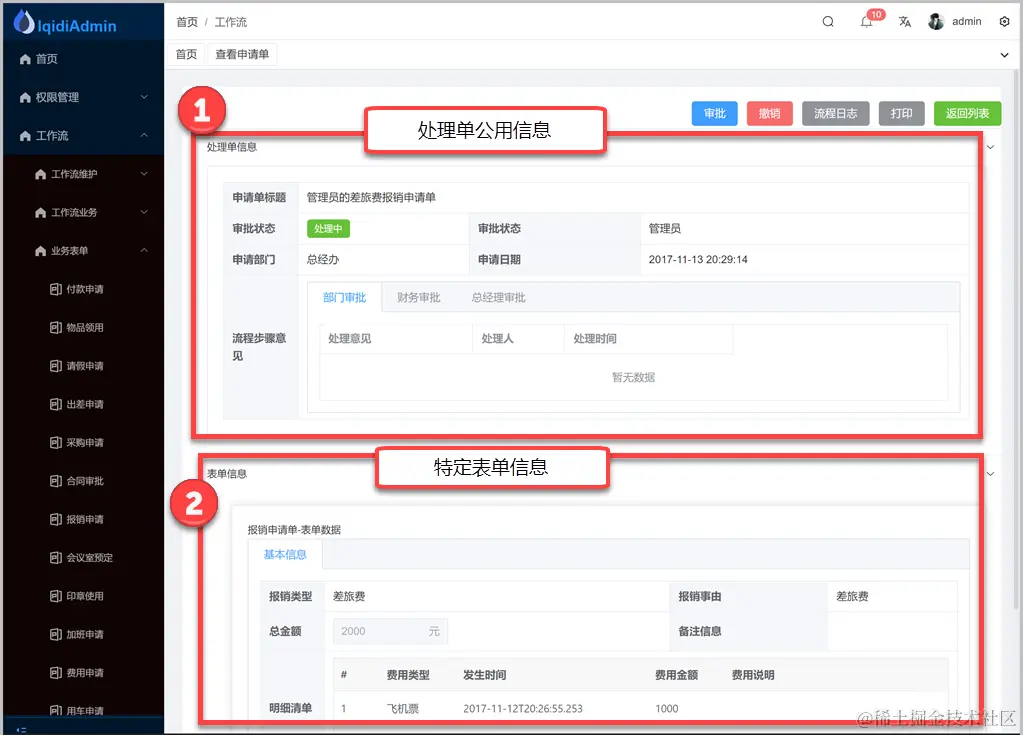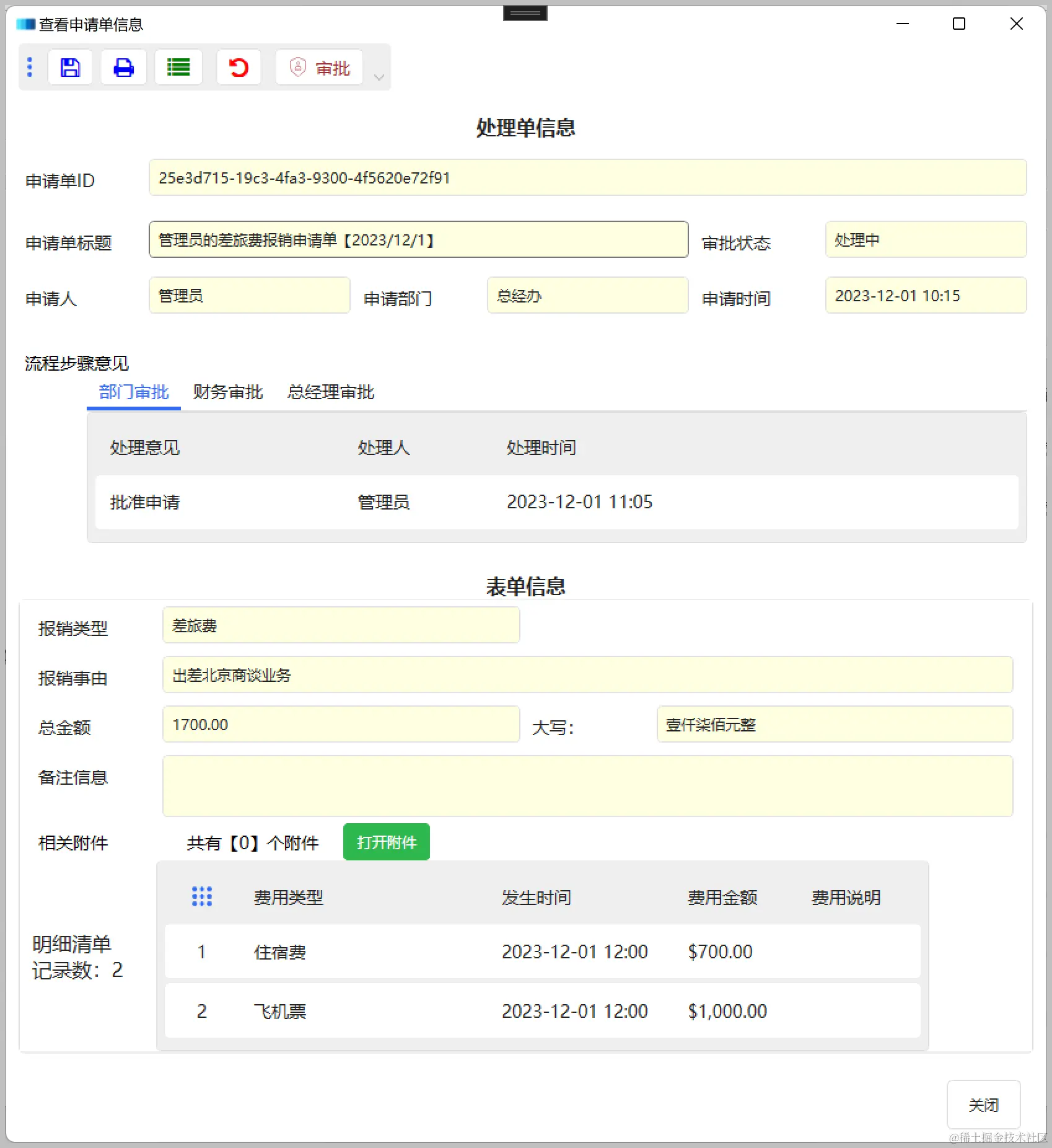 查看具体的一个申请单,可以看到相关的基础表单信息、业务表单信息、以及工作流的日志、相关处理操作按钮等信息,如下界面所示。