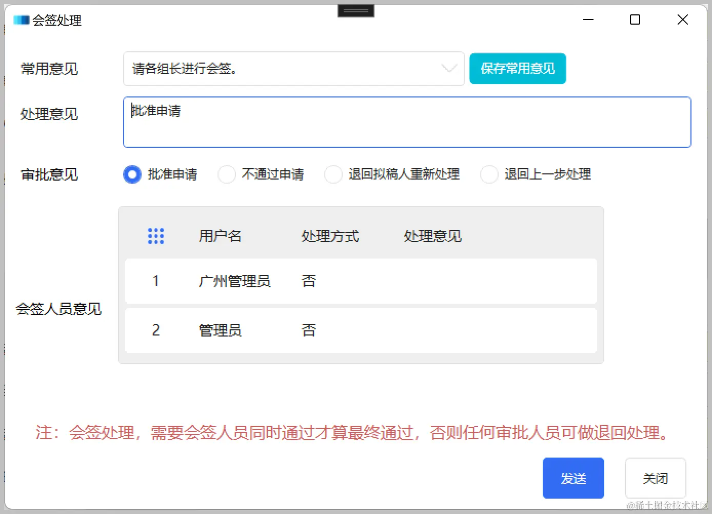 其中包括常用意见列表、以及批准申请、退回拟稿人重新处理、退回上一步处理等过程,不同的处理方式,处理不同。