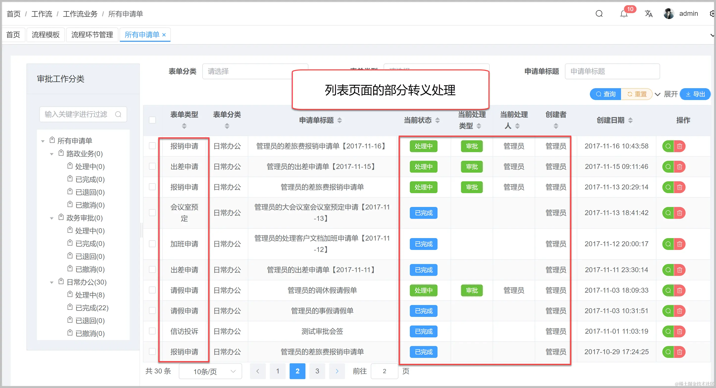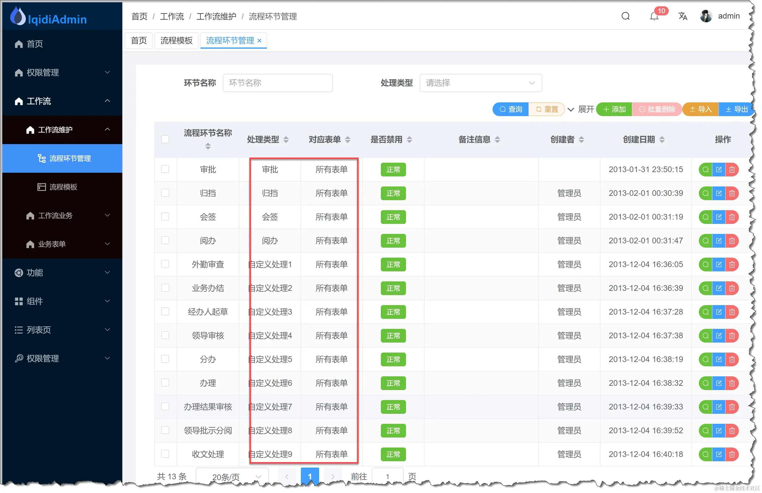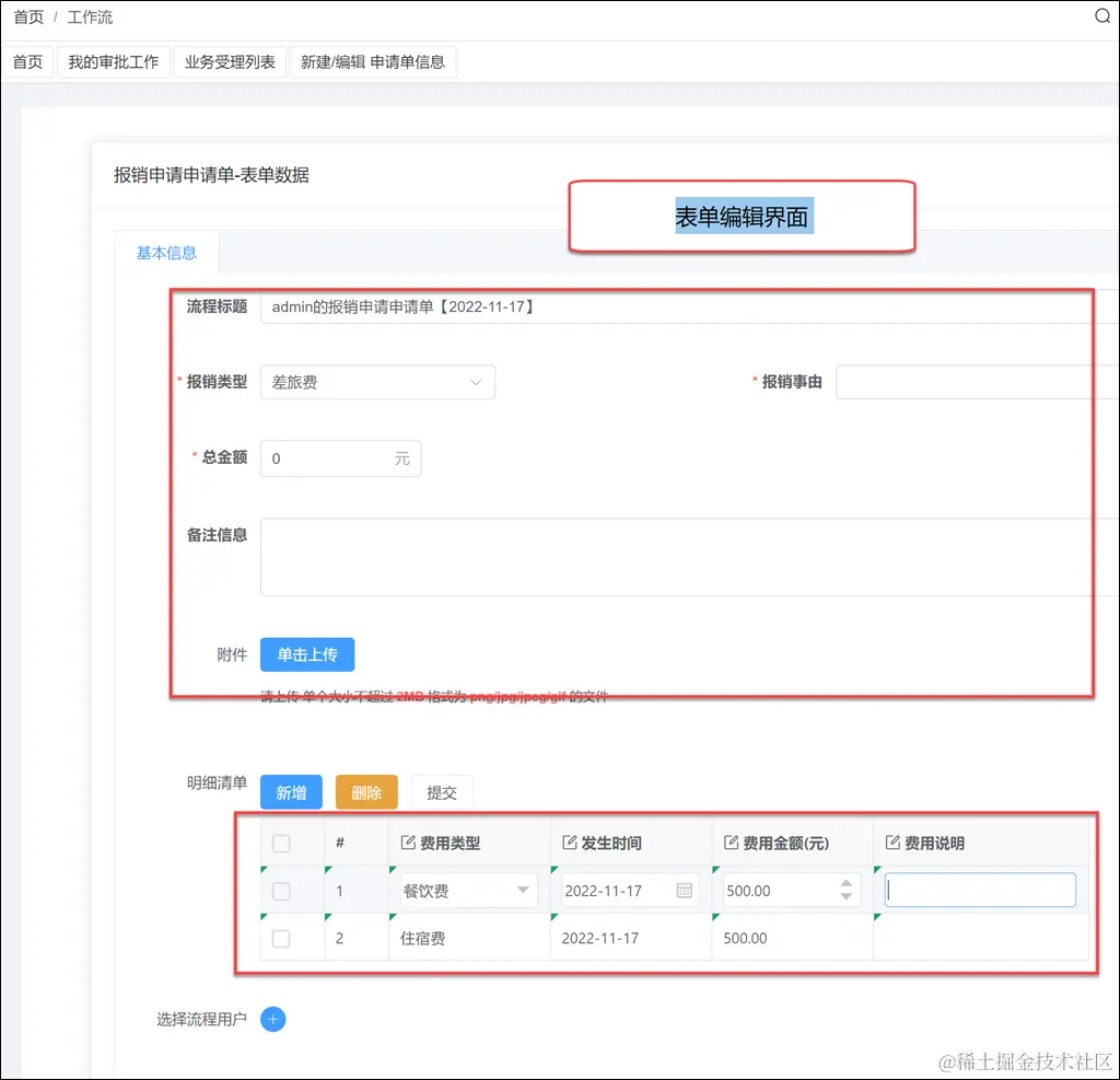 而工作流的新增、编辑界面也是类似,通过动态化组件的方式合并公用信息和特定表单组件信息。