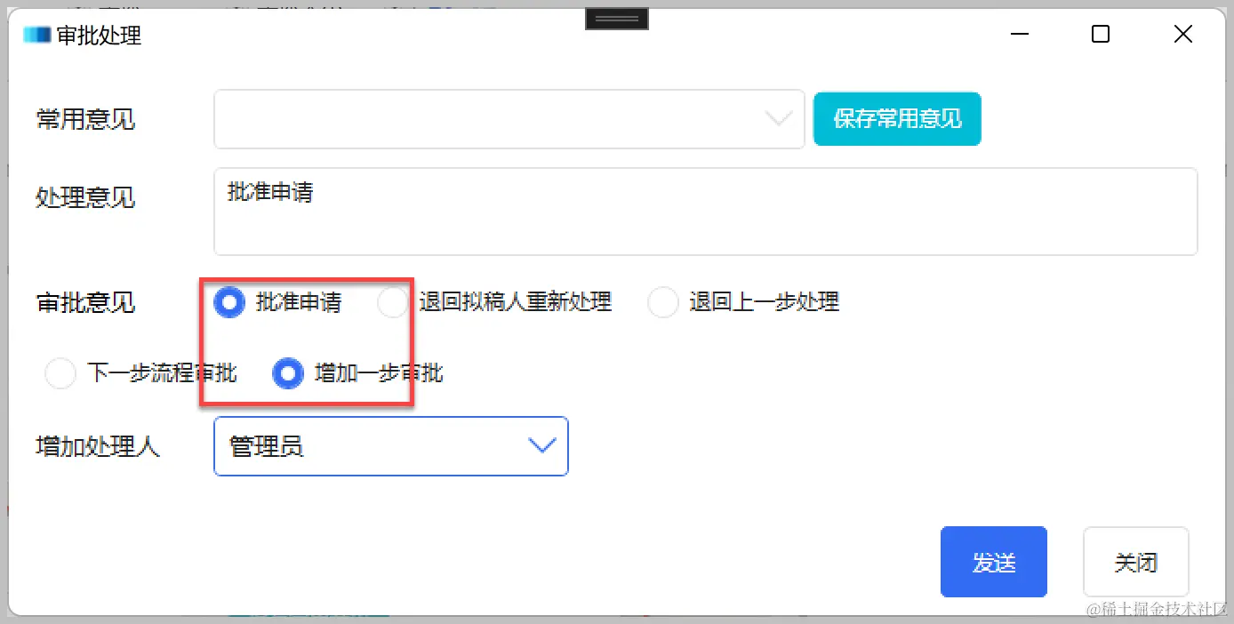 如果是批准申请,还可以选择增加一个步骤,或者默认下一步处理。
