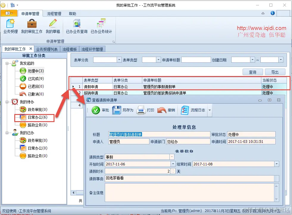 发起申请后,可以在【我的审批工作】中查看到待办或者已办的申请单,如下界面所示。
