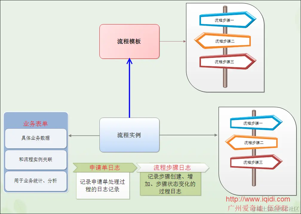 在工作流处理表中,首先我们区分流程模板和流程实例两个部分,这个其实就是类似模板和具体文档的概念,我们一份模板可以创建很多个类似的文档,文档样式结构类似的。同理,流程模板实例为流程实例后,就是具体的一个流程表单信息了,其中流程模板和流程实例表单都包括了各个流程步骤。在流程实例的层次上,我们运行的时候,需要记录一些日志方便跟踪,如流程步骤的处理日志,流程实例表单的处理日志等这些信息。