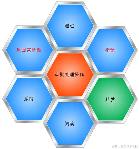 对于一个流程处理操作,我们知道一般有审批通过、拒绝、退回到某步骤、转发到内部阅读、阅读,以及包括起草者能撤销表单呢等操作,当然如果还有一些具体的业务,可能还会有一些流程的处理才操作,不过基本上也可以归结为上面几种,只是他们每步处理的数据内容不同而已。因此审批的操作步骤分类如下所示。