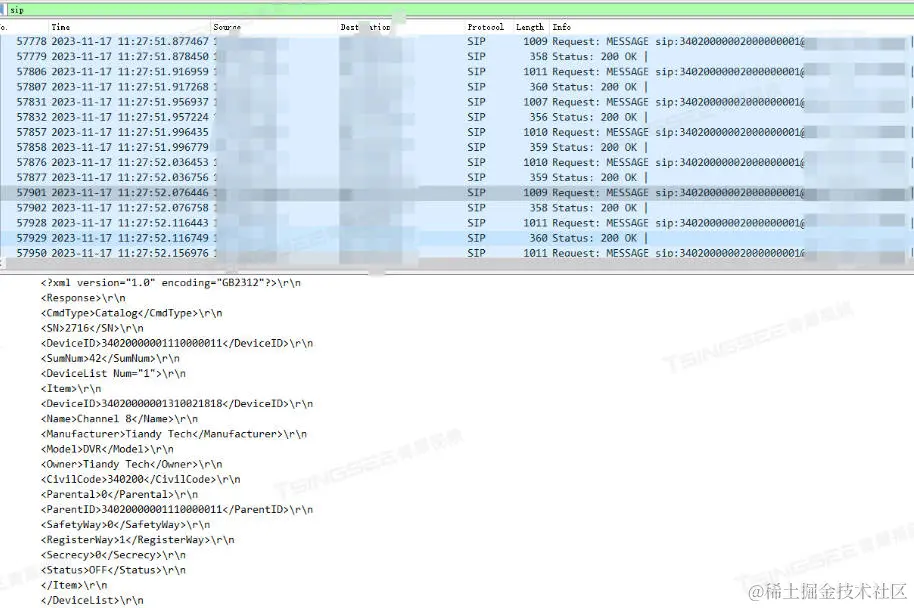 技术人员抓包排查发现,用户项目现场的设备发送了视频通道和告警通道,但是只有告警通道平台回复了200 ok,设备通道平台并未回复。
