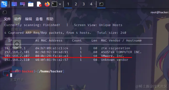 可以确定MAC设备名一栏为VMware, Inc.的一项即为靶机,IP地址为192.168.2.107