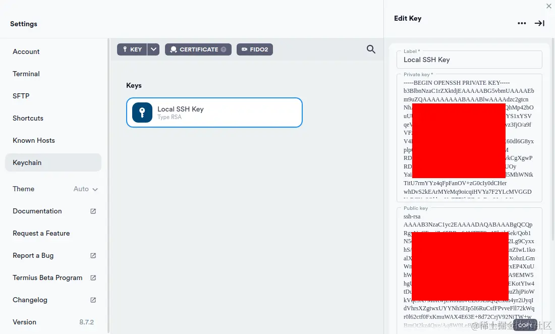 随后打开Termius的设置面板,点击Keychain一项,将生成的SSH公私钥信息添加进去: