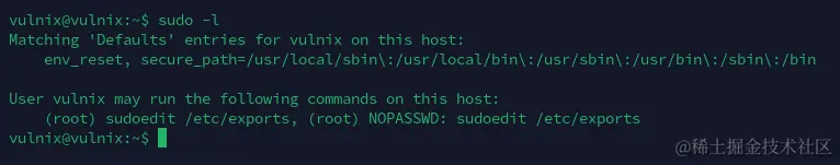 使用sudo -l命令查看该用户是否有Sudo权限,发现该用户可以无密码修改NFS配置文件/etc/exports: