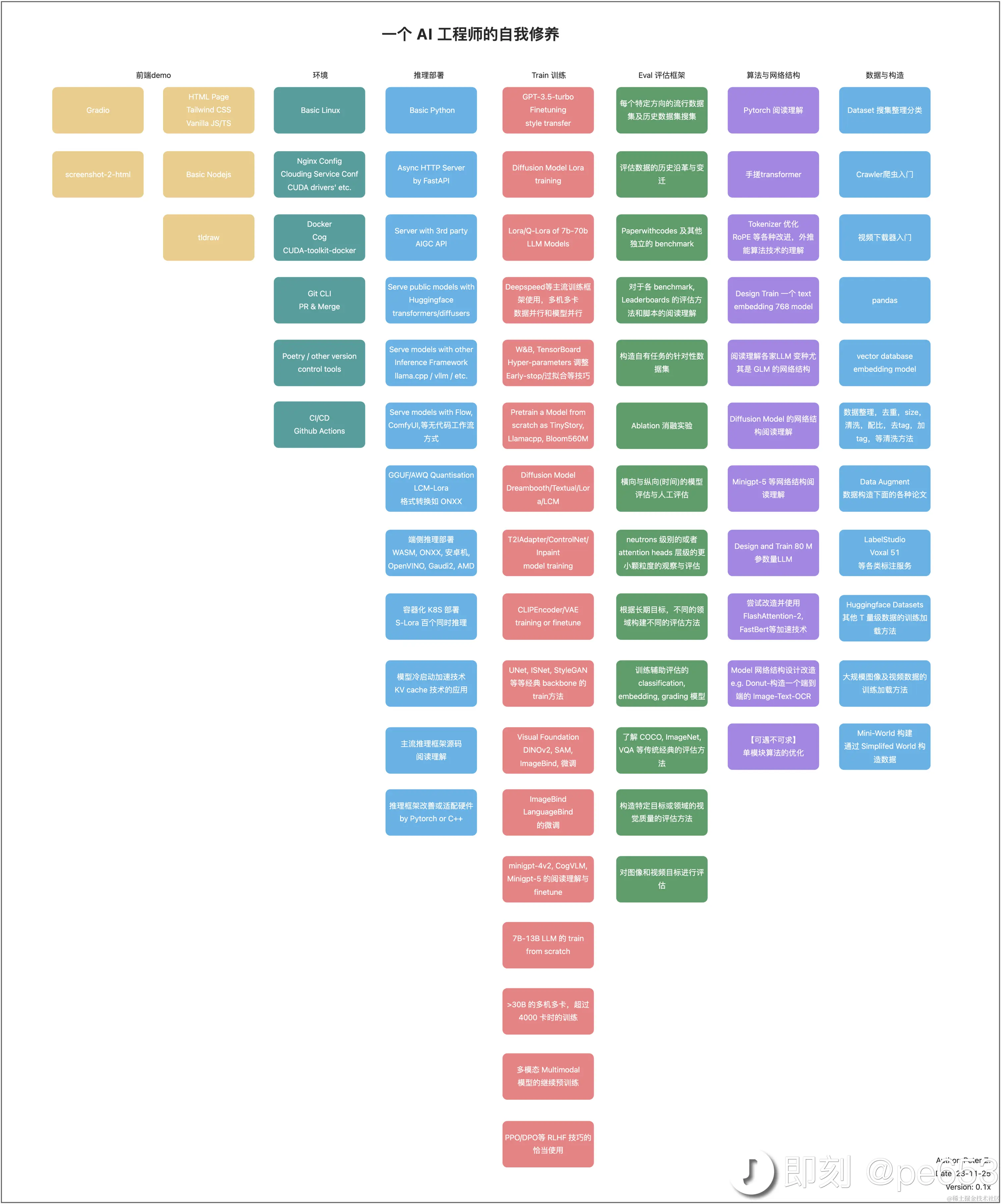 这是即刻用户 @pe653 分享的一份「AI工程师」学习路径,包括前端demo、环境、推理部署、Train训练、Eval评估框架、算法与网络结构、数据与构造等7个知识领域,共75个技能板块 ༼ つ ◕_◕ ༽つ