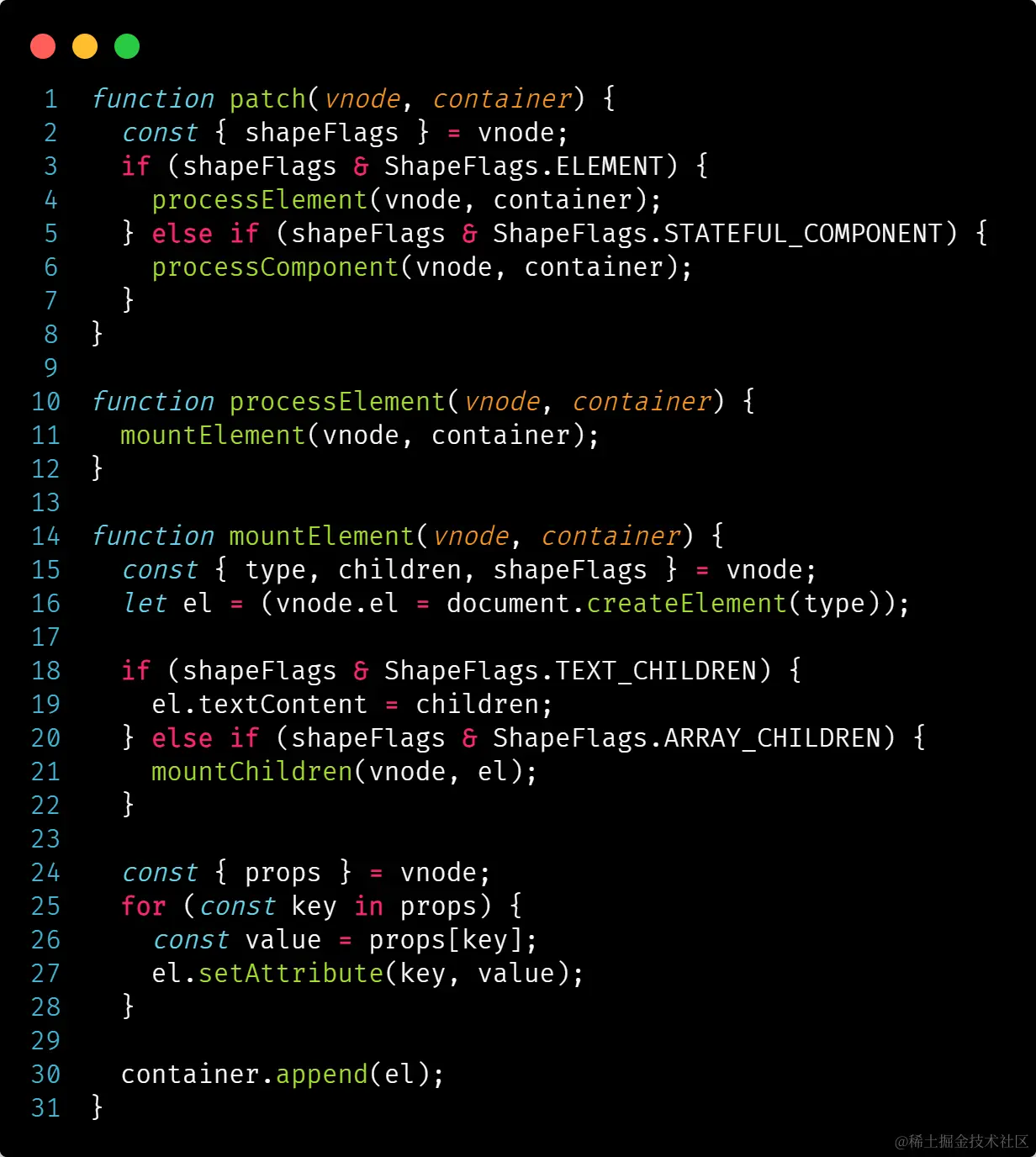假设当前vnode节点的类型是字符串,也就是我们定义的element,是 0001 ,当在判断时,只需要再用 0001 进行与运算,也就是 &,0001 & 0001等于 1,即为真;假设当前这个vnode不是 0001,而是个stateful_component,也就是0010 ,0010 & 0001等于 0,即为假。
