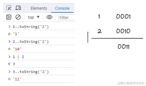 [x]..toString('2')可以获取数值的二进制形式,1 的二进制就是 0001,不足会补充 0 ;1 << 1就是表示二进制 0001 左移 1 位,即 0010 ,也就是计算得到的 2 。1 << 2就是 0001 左移 2 位,即 0100 。