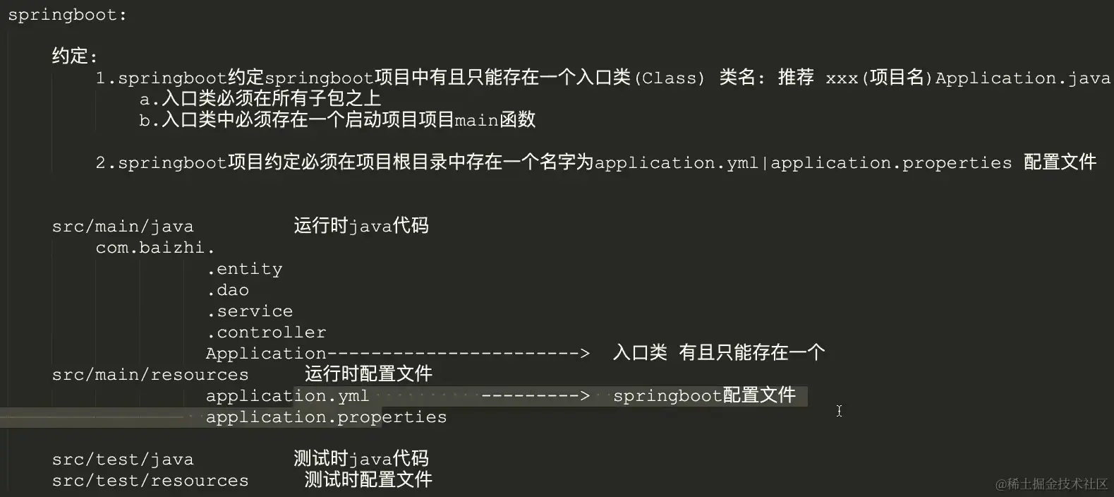 - SpringBoot遵循“约定优于配置”的原则,提供了一些默认的约定必须遵守,以简化项目的配置和开发流程: