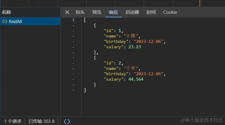 @RestController //代表类中返回值转为json响应到浏览器 public class EmpController { private final EmpService empService; @Autowired public EmpController(EmpService empService) { this.empService = empService; } //保存 @RequestMapping("save") public void save(Emp emp) { empService.save(emp); } //查询所有 @RequestMapping("findAll") public List<Emp> findAll() { return empService.findAll(); } }测试结果,可以正常添加和查询所有