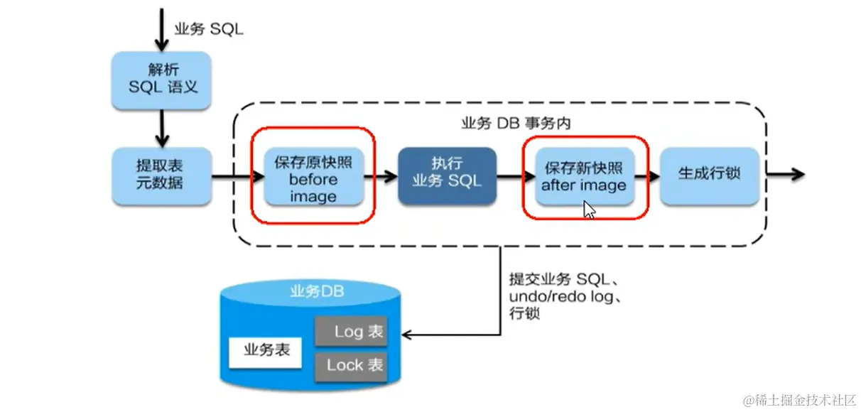 - 在业务数据更新之后,其保存成“after image”,最后生成行锁。