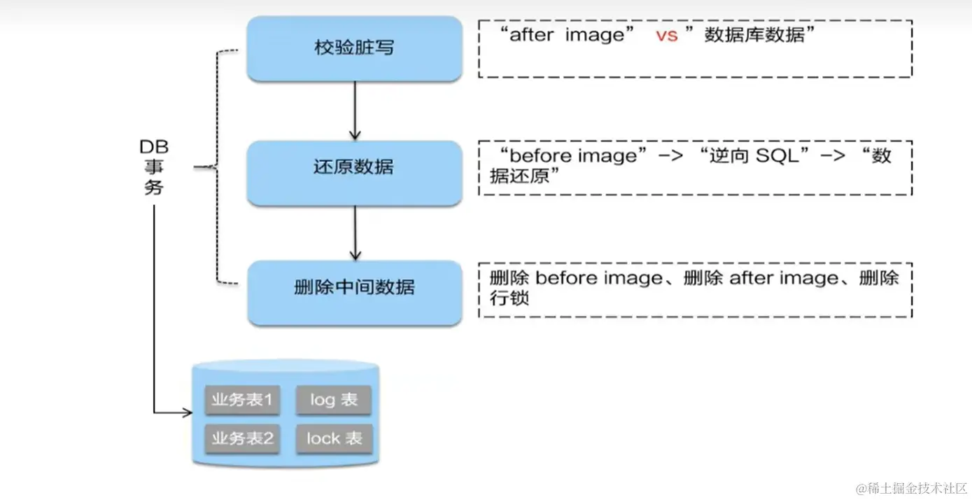 二阶段如果是回滚的话,Seata 就需要回滚一阶段已经执行的“业务 SQL”,还原业务数据。回滚方式便是用“before image”还原业务数据。