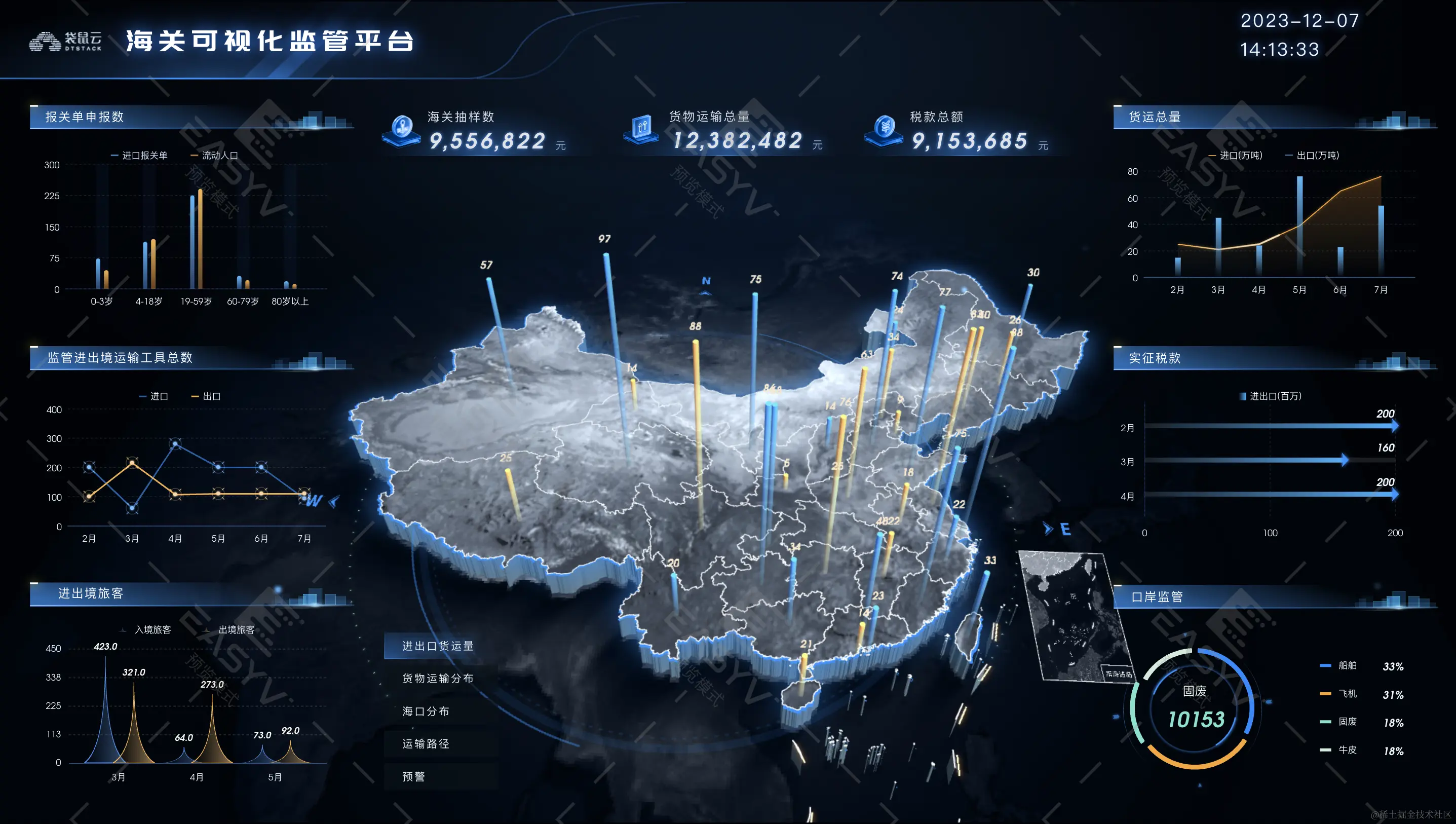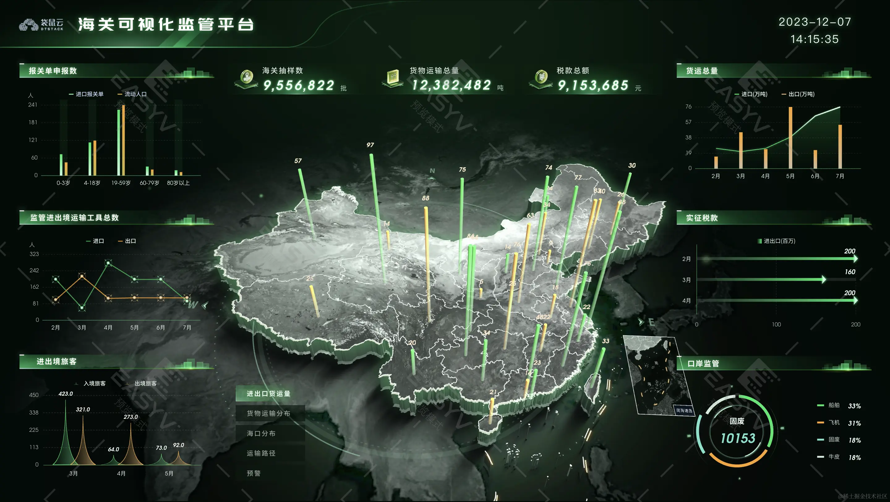 海关可视化监管平台是一种重要的工具,它利用先进的技术和智能化系统,实现了海关监管工作的可视化和信息化。这个平台不仅提供了丰富的数据,还能直观地展示各项监管指标的情况,让海关工作人员能够更加清晰地了解海关业务的运行状况。海关可视化监管平台的建设不仅提高了海关工作的效率,还提升了监管工作的质量。通过实时监控和数据分析,海关工作人员能够发现问题和风险,并及时采取相应的措施,确保货物的安全和便利通关。此外,海关可视化监管平台还能为企业提供更加优质的服务。通过平台上的数据查询和管理功能,企业能够更方便地了解和了解海关政策和规定,优化运输方案,减少运营成本。这不仅有利于企业的发展,也有利于推动国际贸易的便利化和自由化。海关可视化监管平台是现代化海关管理的重要一环,它能够帮助海关工作人员更好地开展工作,提高监管的精准性和效率。不仅如此,海关可视化监管平台还将进一步发挥作为智慧海关的作用,促进贸易便利化和国际物流发展。相信在未来,海关可视化监管平台将会发挥更加重要的作用,为海关管理工作带来更多的便利和效益。