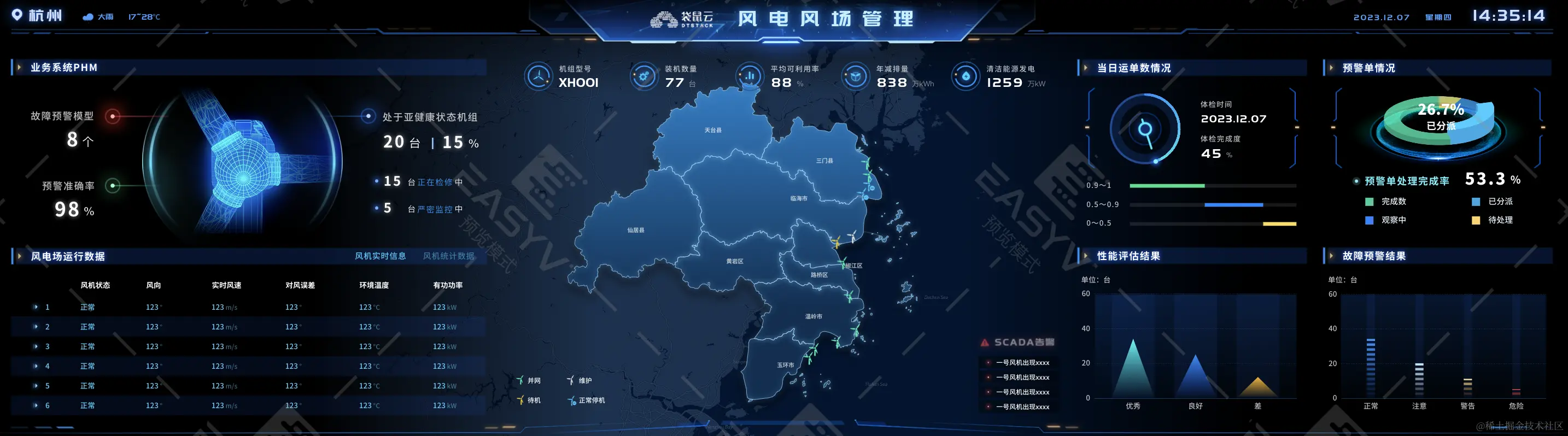 风电智慧运营可视化大屏是一种先进的技术工具,它通过将风电运营数据以可视化的形式呈现在屏幕上,为用户提供了更加直观、便捷的信息展示方式。这种大屏可以将风电的实时数据、运行状态、产能情况等各项指标一目了然地展示出来,使管理人员能够随时了解风电场的运行情况,及时做出相应的决策。同时,大屏还能提供数据分析功能,通过对风电数据的深入挖掘和分析,可以帮助用户发现其中的规律和问题,并提供相应的解决方案。这样一来,便能够实现风电场的智能化运营管理,提高工作效率,降低成本。此外,大屏的可视化效果也为用户提供了一种全新的视觉体验,使数据变得更加生动和具体。用户可以通过触摸屏幕或者鼠标操控来自定义展示内容和参数设置,从而实现个性化的需求。总之,风电智慧运营可视化大屏的出现为风电行业带来了新的发展机遇,也为风电管理者提供了更多的便利和选择,有望推动整个行业的进步和发展。欢迎大家前往易知微参与体验。