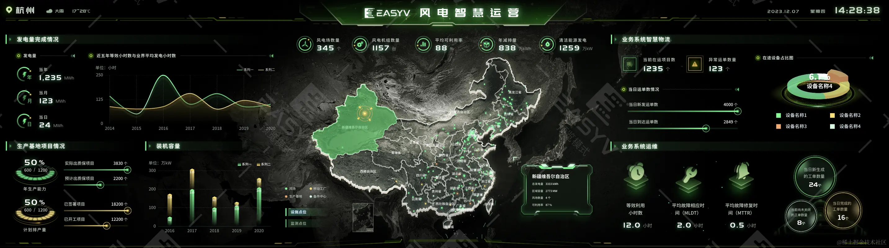 易知微推出的「薄荷绿」风电智慧运营模板,以薄荷绿为主色调,立足风电场,统计展示发电量完成情况、装机容量、业务系统运维效率等指标,结合平面地图,支持对不同地域的风电运营进行综合展示,为用户提供实时的运营决策支持和优化建议,提高运营效率和能源利用率。十分适合应用于决策监控的场景