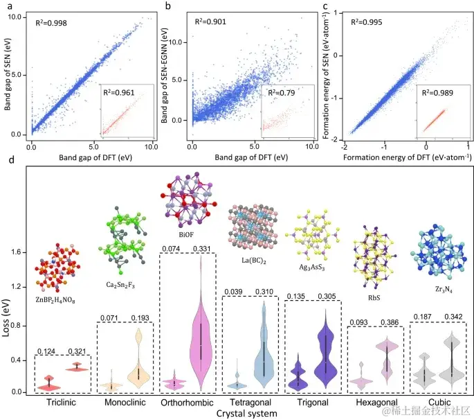 研究人员通过密度泛函理论(DFT)计算,对 Materials Project 数据库中的 6,027 个晶体材料组成的数据集进行了预测,并基于预测结论对 SEN 模型的性能进行了检验。