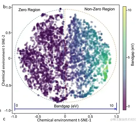 为了验证机器学习模型所学习的特征-属性关系符合基本物理原理,研究人员生成了 Ca-O-X 材料的化学环境 2D t-SNE 图,并调查了各种材料特征(成分、点群、自旋极化等),最终发现,材料带隙取决于复杂的材料特征,不能简单地由任一关键因素来预测。