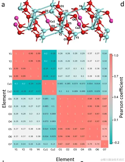 具体而言,研究人员提取了 Y4Cu2O7 的原胞中每个原子的化学环境矩阵。计算了原子矩阵之间的 Pearson 系数,生成了上图所示的相关性分析图。与不同元素组的原子相比,同一元素组内的原子之间的 Pearson 系数要大得多,因此可以清楚地区分出 Y4Cu2O7 中的 3 个元素组。