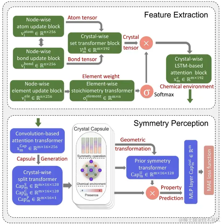 其次,该研究创新性地将胶囊机制 (capsule mechanism) 应用于材料属性预测,通过基于胶囊机制设计的对称性感知模块,将材料化学环境转换为由对称算子、卷积材料化学环境和存在值组成的材料胶囊,以感知并保留晶体对称性。进而,通过在材料的化学环境矩阵上进行对称运算,可以将不同的对称图案推广到晶体胶囊中。