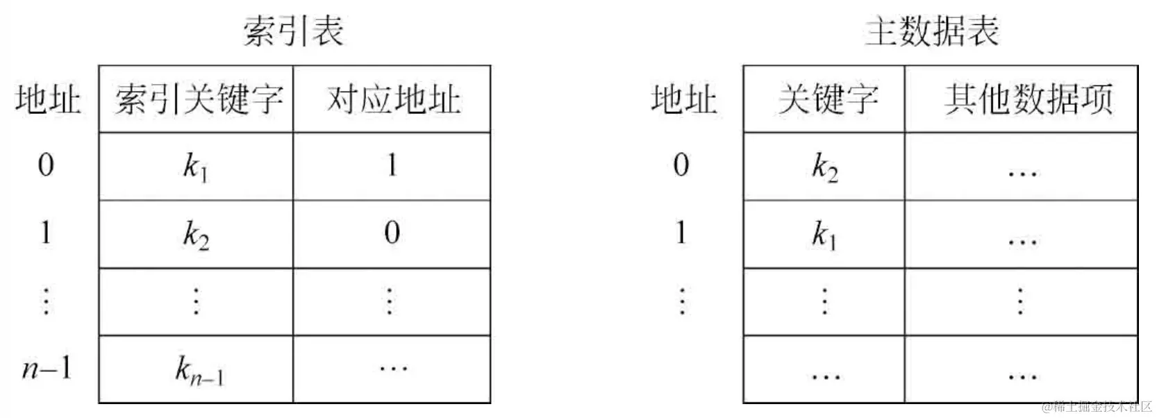- 索引表中的元素分为关键字和地址两部分。