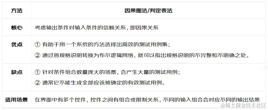 3.将因果图转换为判定表,并将判定表的每一列拿出来就可作为一个测试用例