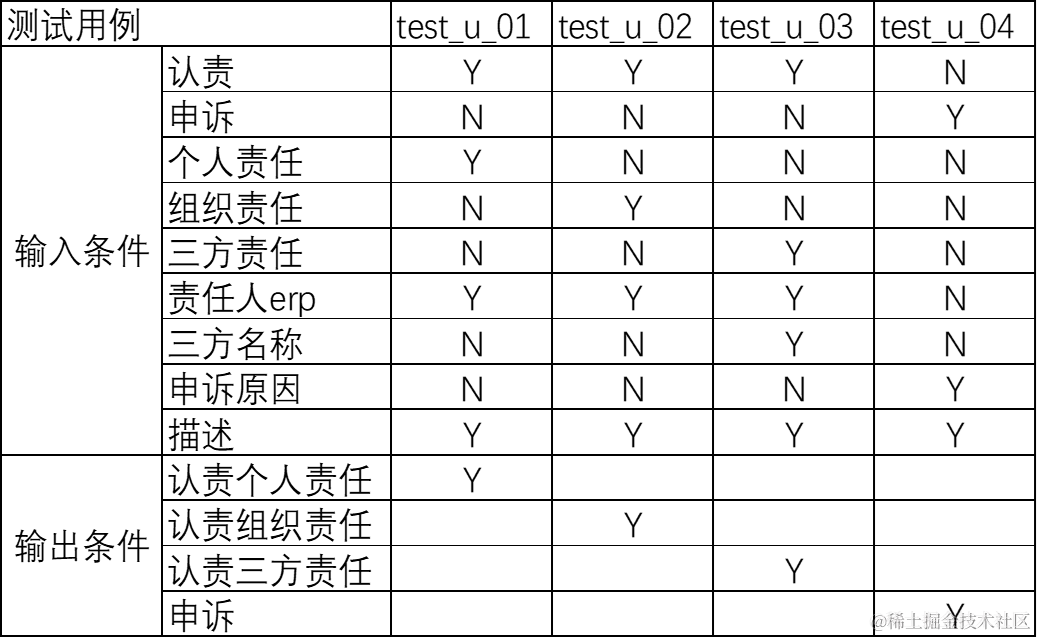 - 为判定表中的每一列表示的情况设计测试用例(每一列都是一条测试用例)。