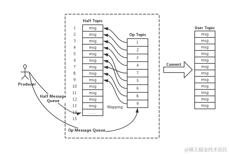 在执行二阶段Commit操作时,需要构建出Half消息的索引。一阶段的Half消息由于是写到一个特殊的Topic,所以二阶段构建索引时需要读取出Half消息,并将Topic和Queue替换成真正的目标的Topic和Queue,之后通过一次普通消息的写入操作来生成一条对用户可见的消息。所以RocketMQ事务消息二阶段其实是利用了一阶段存储的消息的内容,在二阶段时恢复出一条完整的普通消息,然后走一遍消息写入流程。