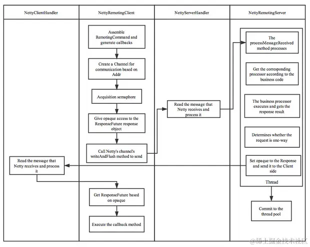 在RocketMQ消息队列中支持通信的方式主要有同步(sync)、异步(async)、单向(oneway) 三种。其中“单向”通信模式相对简单,一般用在发送心跳包场景下,无需关注其Response。这里,主要介绍RocketMQ的异步通信流程。