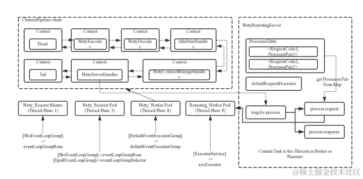 上面的框图中可以大致了解RocketMQ中NettyRemotingServer的Reactor 多线程模型。一个 Reactor 主线程(eventLoopGroupBoss,即为上面的1)负责监听 TCP网络连接请求,建立好连接,创建SocketChannel,并注册到selector上。RocketMQ的源码中会自动根据OS的类型选择NIO和Epoll,也可以通过参数配置),然后监听真正的网络数据。拿到网络数据后,再丢给Worker线程池(eventLoopGroupSelector,即为上面的“N”,源码中默认设置为3),在真正执行业务逻辑之前需要进行SSL验证、编解码、空闲检查、网络连接管理,这些工作交给defaultEventExecutorGroup(即为上面的“M1”,源码中默认设置为8)去做。而处理业务操作放在业务线程池中执行,根据 RomotingCommand 的业务请求码code去processorTable这个本地缓存变量中找到对应的 processor,然后封装成task任务后,提交给对应的业务processor处理线程池来执行(sendMessageExecutor,以发送消息为例,即为上面的 “M2”)。从入口到业务逻辑的几个步骤中线程池一直再增加,这跟每一步逻辑复杂性相关,越复杂,需要的并发通道越宽。