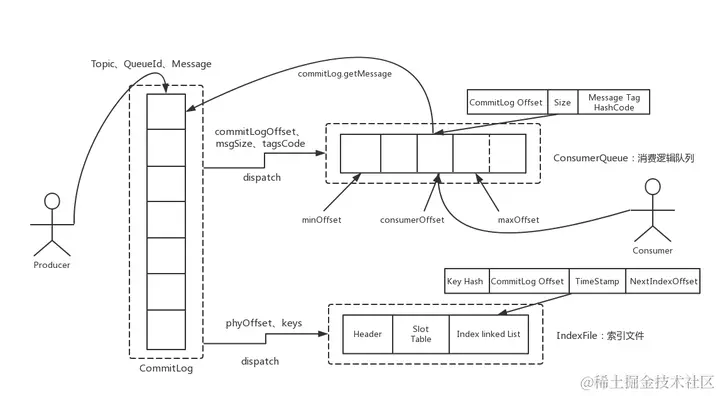 “按照Message Key查询消息”的方式,RocketMQ的具体做法是,主要通过Broker端的QueryMessageProcessor业务处理器来查询,读取消息的过程就是用topic和key找到IndexFile索引文件中的一条记录,根据其中的commitLog offset从CommitLog文件中读取消息的实体内容。