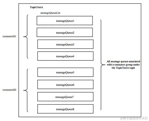 消息消费队列在同一消费组不同消费者之间的负载均衡,其核心设计理念是在一个消息消费队列在同一时间只允许被同一消费组内的一个消费者消费,一个消息消费者能同时消费多个消息队列。