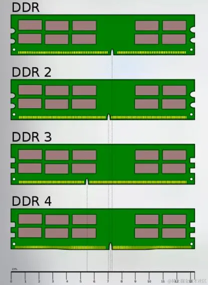 内存代数 目前为止市场上常见的内存主要为DDR内存,共有五代。表示方式为PC1、PC2、PC3、PC4、PC5。**不同代数之间内存是不兼容的,不能混用,**在金手指插口处做了防呆处理,不同的代数金手指处防呆口的位置不一致。
