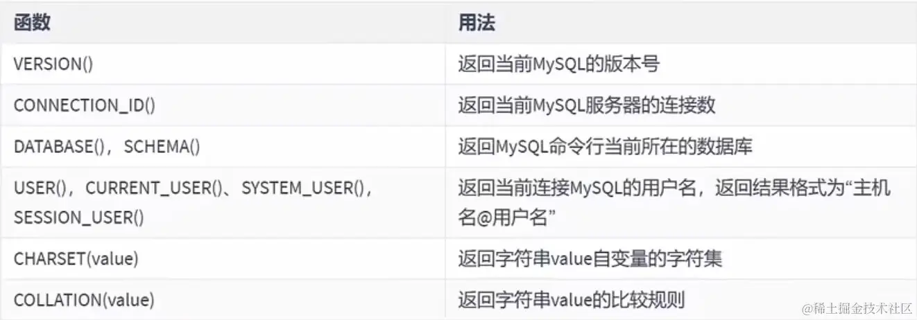 MySQL中内置了一些可以查询MySQL信息的函数,这些函数主要用于帮助数据库开发或运维人员更好地对数据库进行维护工作。