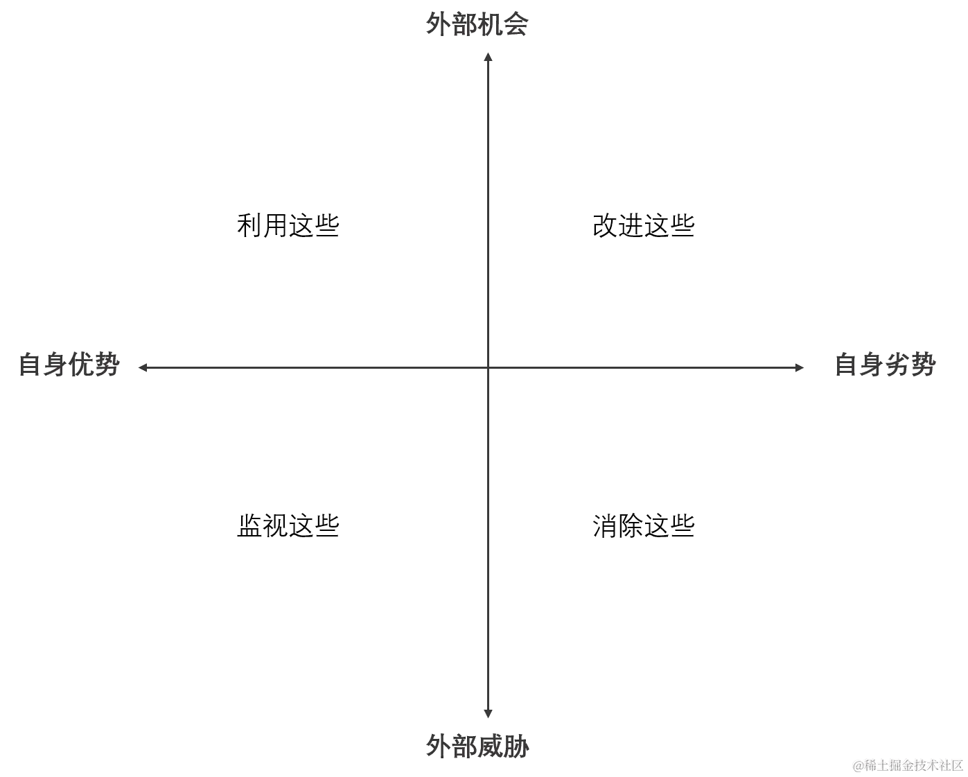 进行SWOT分析也没说的那么复杂,你只要记住 “两条线画成四象限 ”,即自身优势S/劣势W+外部机会O/威胁T,如图: