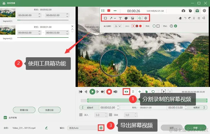 步骤3:录制过程中,您可以使用软件自带的工具箱,对屏幕进行标注、添加箭头等操作,录制结束后,保存录制的电脑视频或对视频进行剪辑。