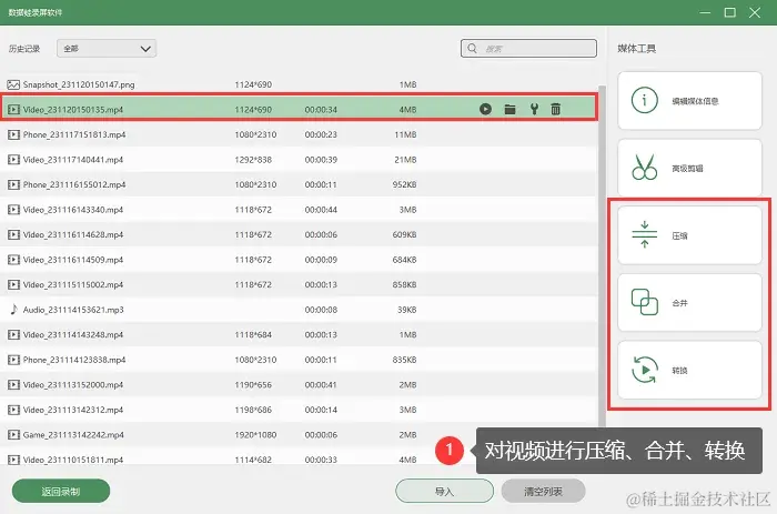步骤4:在历史记录页面,您可以对录制的视频进行更多操作,例如视频压缩、视频合并、视频转换等。
