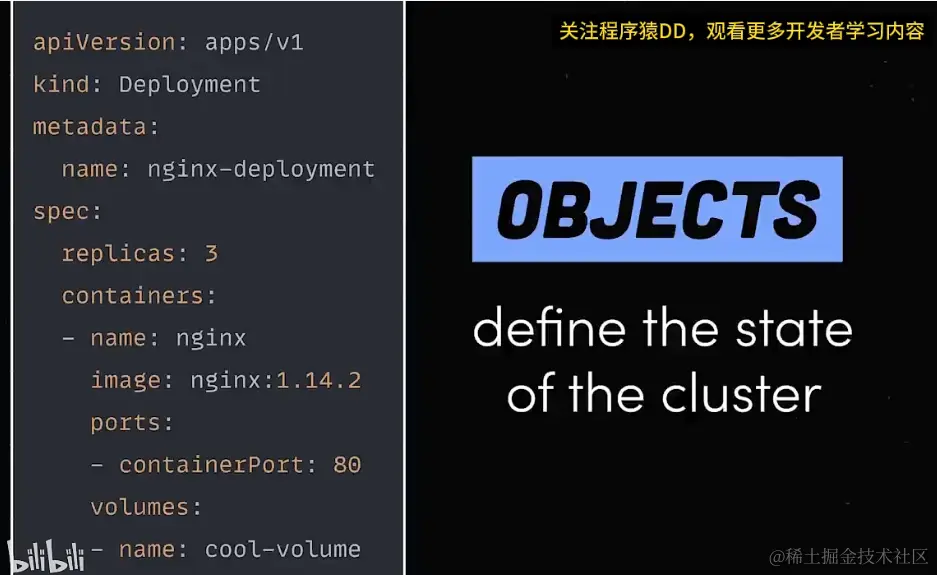 例如,我们可能有一个 nginx 部署,其中包含一个包含三个 pod 的副本集。在spec字段中,我们可以准确定义它的行为方式,例如它的容器、卷、端口等。然后,您可以采用此配置并使用它自动配置和扩展容器,并确保它们始终正常运行和健康。