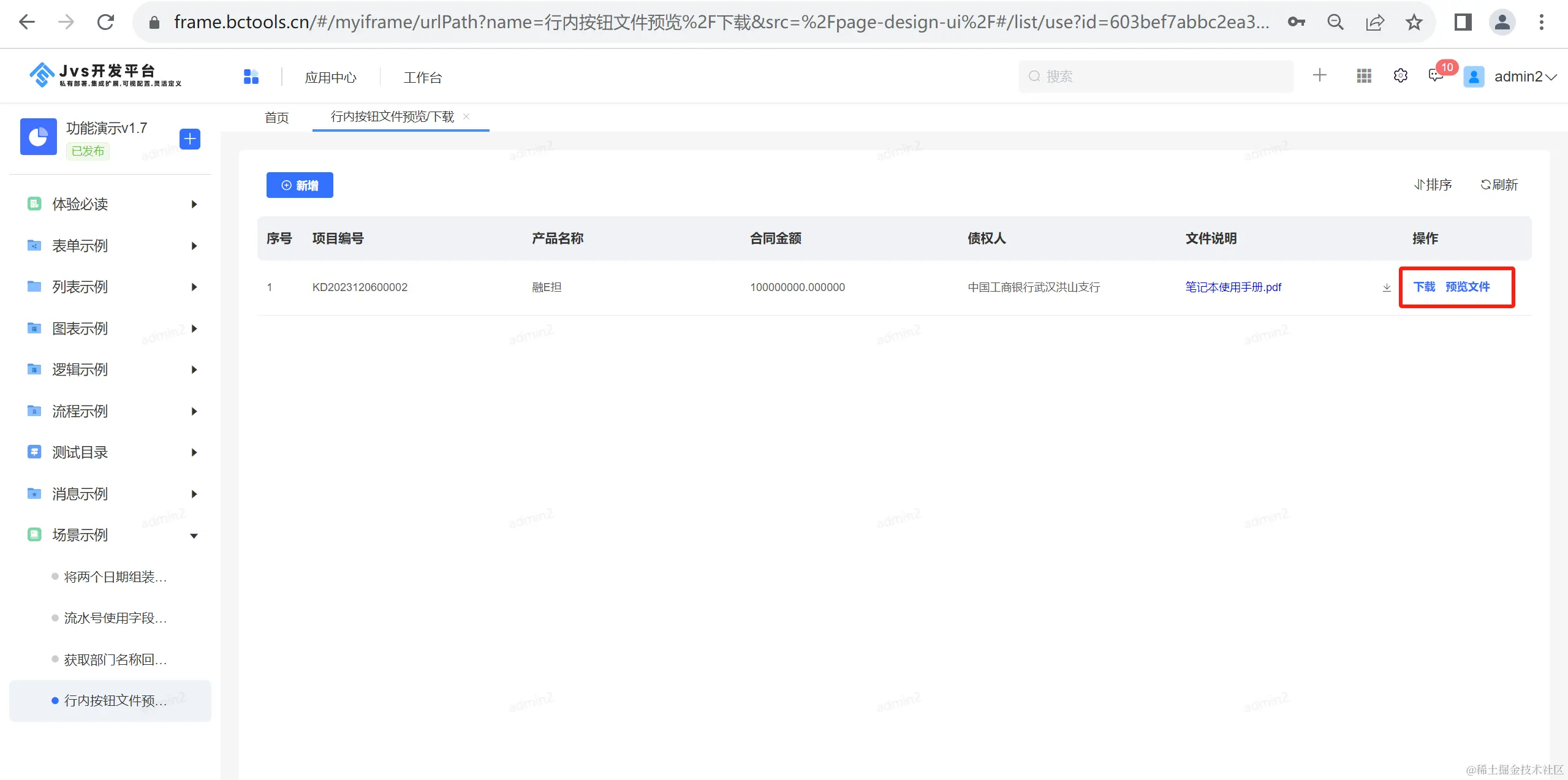 软件通常在列表页行内按钮上有文件预览或下载的功能,这样的场景我们可以直接在平台上通过配置实现。