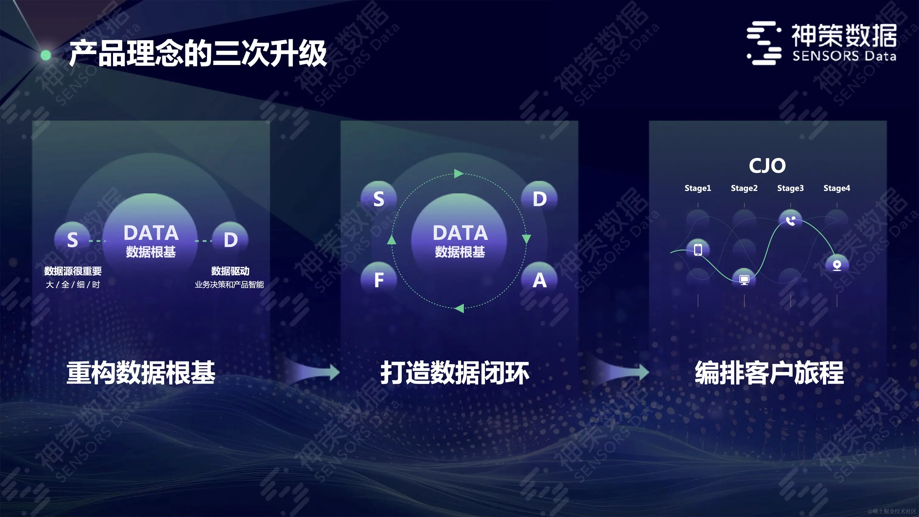 围绕客户经营这一点,神策数据的理念在持续迭代。从成立至今,神策数据完成了经营理念从“重构数据根基”到“打造数据闭环”,再到“编排客户旅程”的升级。