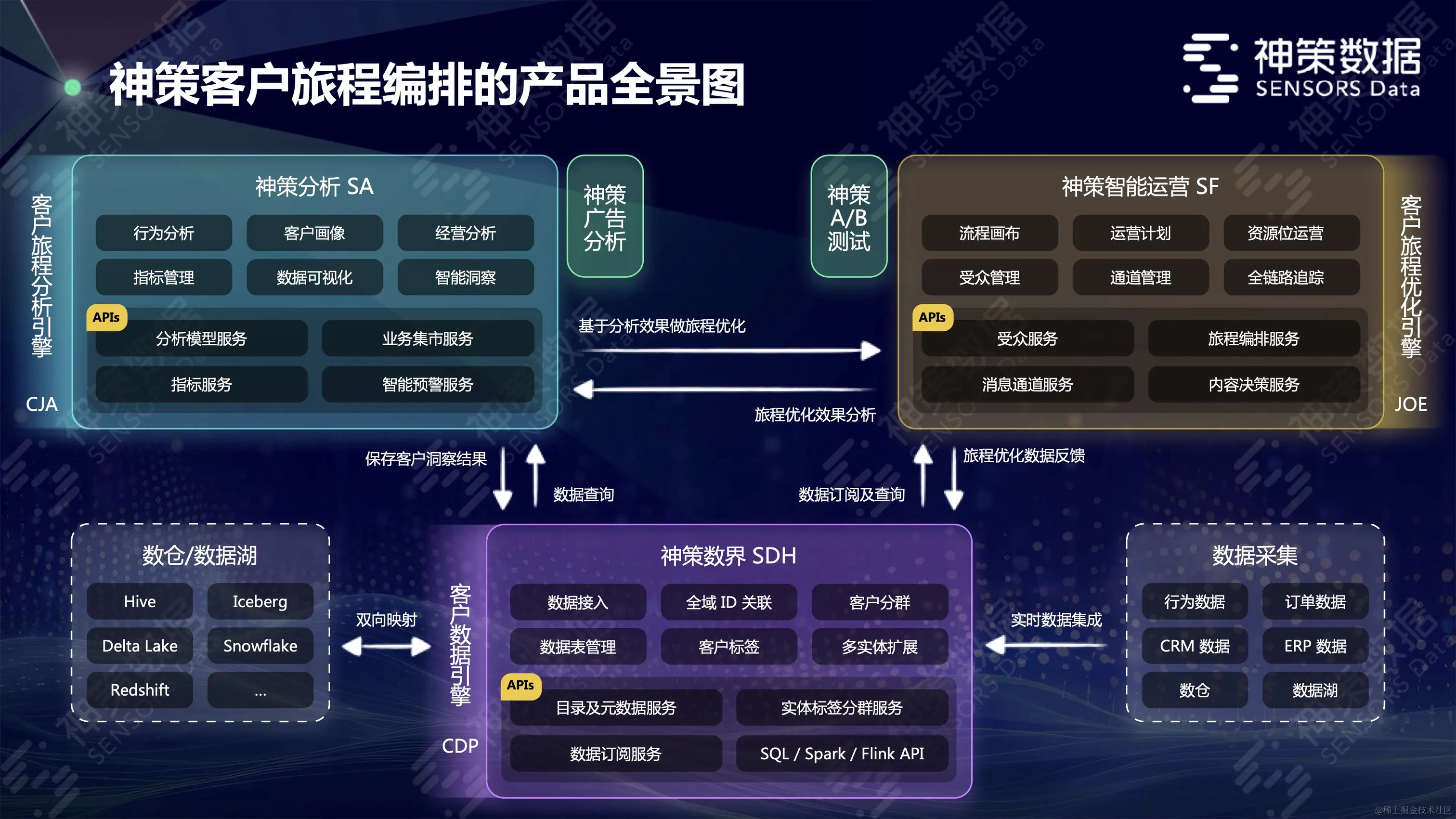 为了做好整个客户旅程的编排,神策数据的核心还是提供基础产品能力和服务能力。我们围绕整个CJO理念构建了神策数据三大引擎:一是客户旅程分析引擎。我们不只是分析某个局部,而是对整个客户旅程进行分析;二是客户旅程优化引擎。不管做A/B测试,还是做旅程编排、流程画布,都属于对客户旅程的优化;三是客户数据引擎。目前国际上大家普遍比较接受CDP的理念。怎样把它整合好、建设好、做用户标签、用户分群,从而更好的支撑客户旅程的分析和优化。