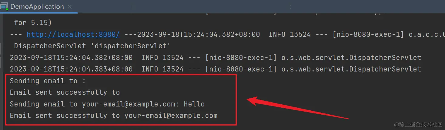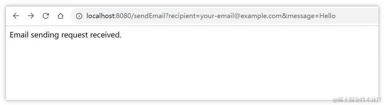 现在,你可以运行 Spring Boot 应用程序。应用程序将启动,并且可以通过访问http://localhost:8080/sendEmail或者http://localhost:8080/sendEmail?recipient=your-email@example.com&message=Hello来触发电子邮件发送请求。