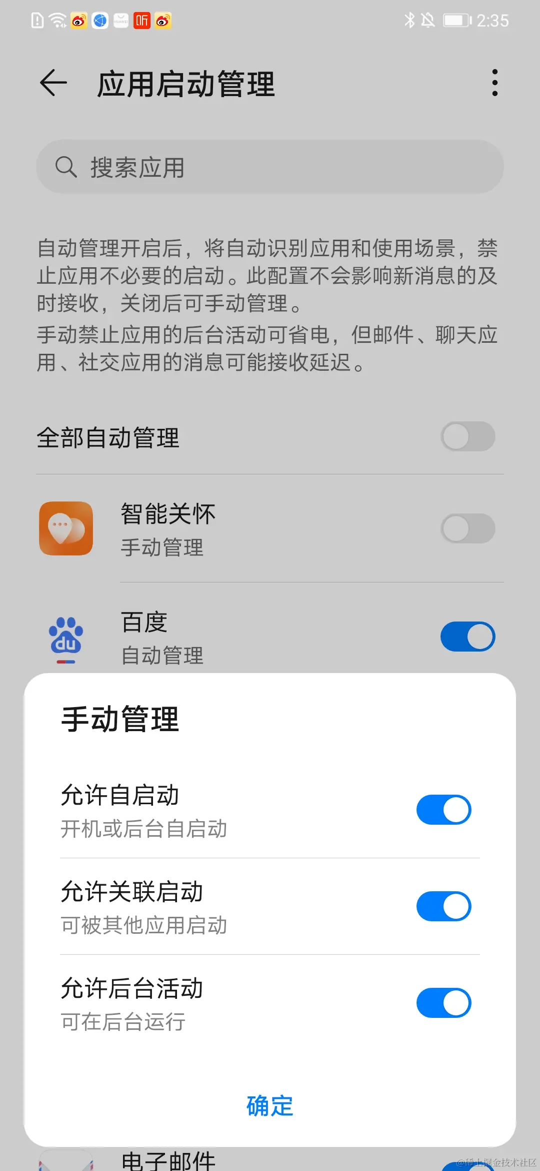 手机进入 手机管家 > 应用启动管理 > 手动管理,关闭微泰动泰右侧自动管理的开关,打开允许自启动、允许关联启动、允许后台活动 三个开关。