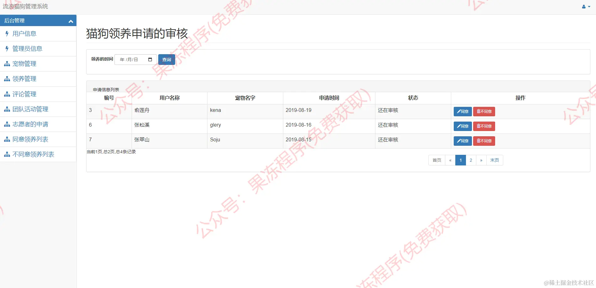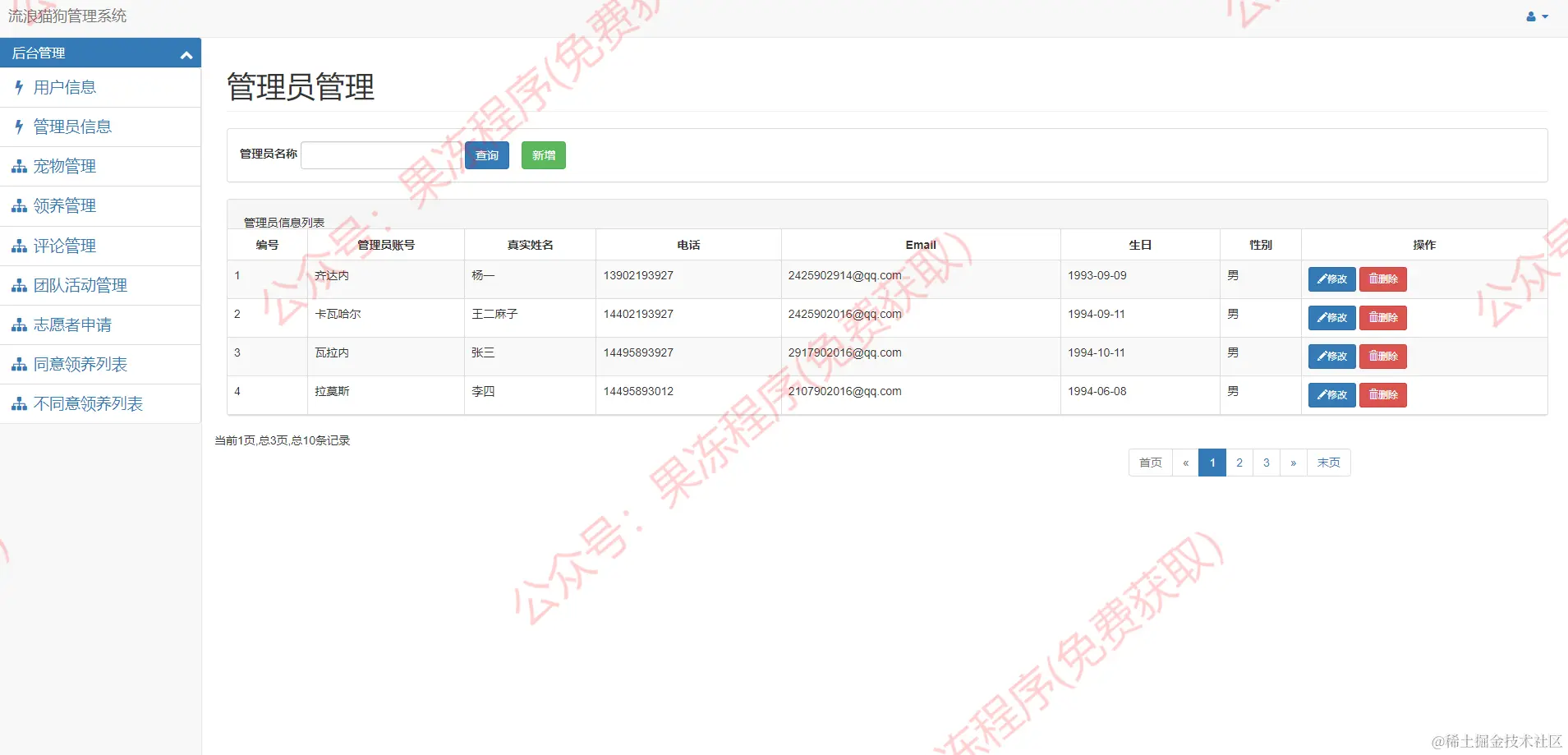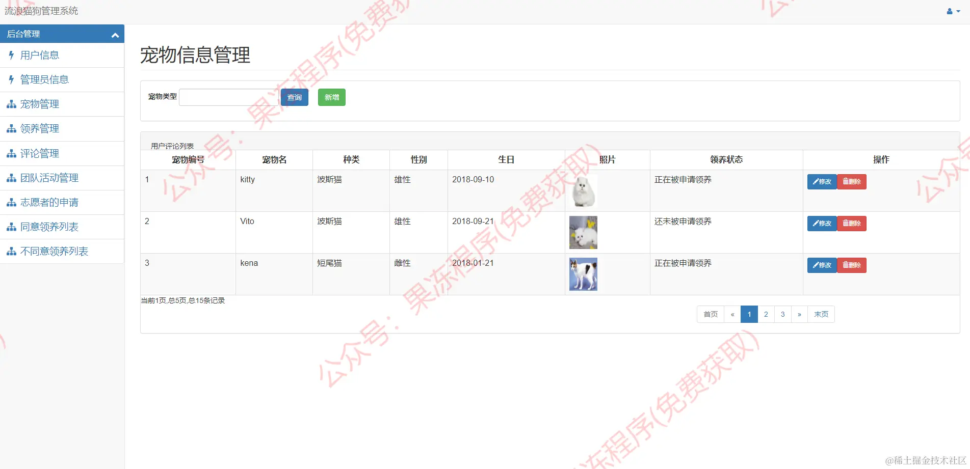 该项目是一个宠物领养系统,页面分为前台首页和后台管理,具体功能菜单如下: