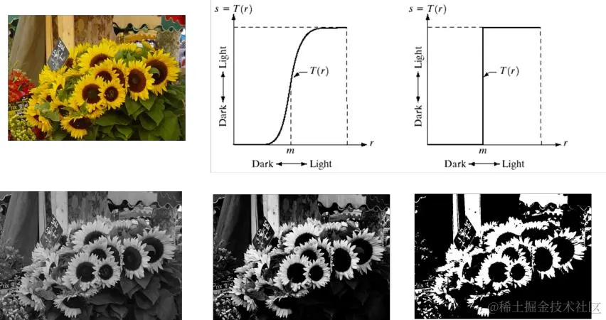 - T最简单的情况是领域大小为1 * 1.这时g只依赖于f在(x,y)处的值,即s=T(r),我们称之为灰度变换或亮度变换,其中s与r分别为输出与输出的亮度值。